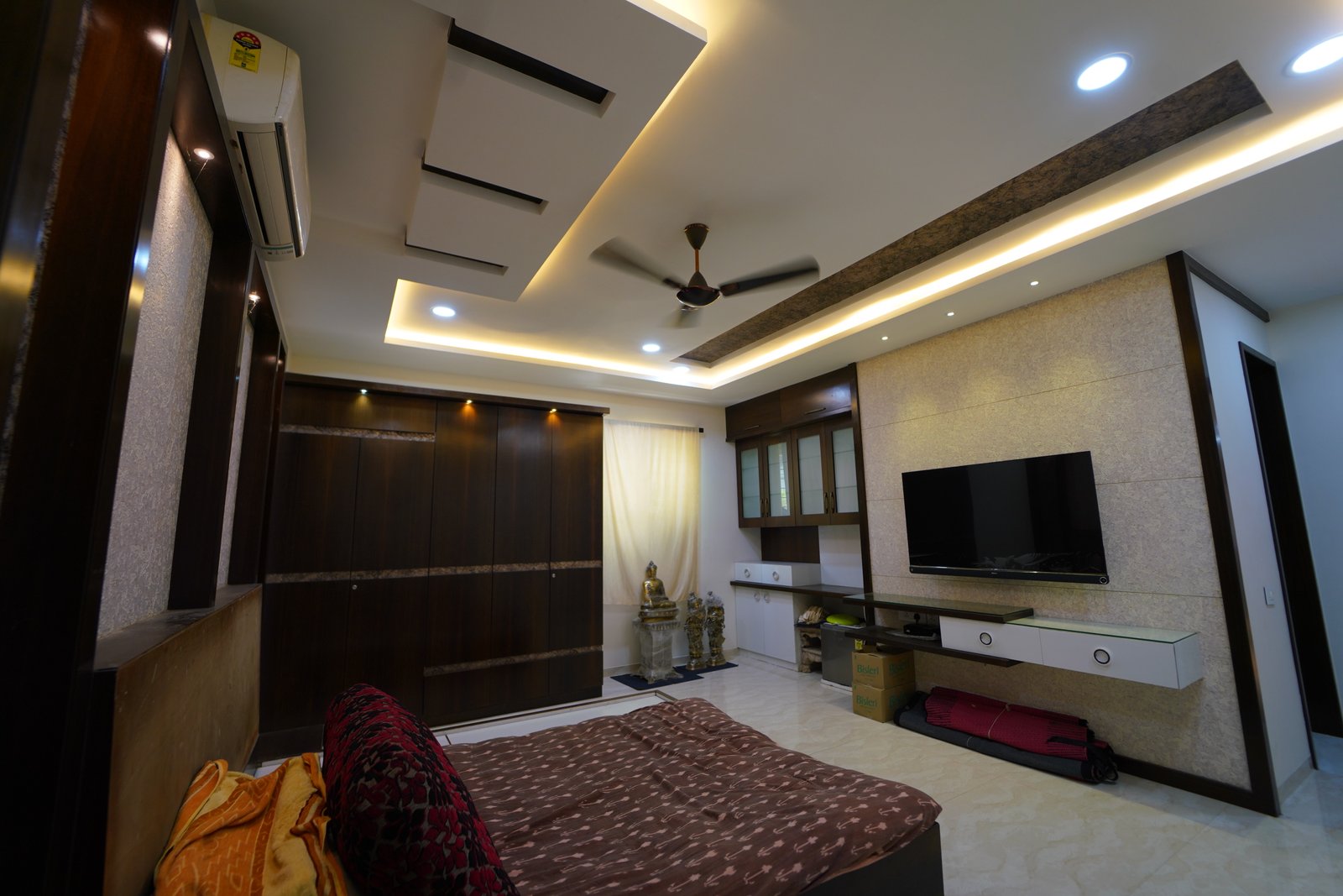 This project showcases a modern master bedroom interior designed with a perfect balance of comfort, elegance, and functionality. The room features a contemporary false ceiling with warm cove lighting, recessed spotlights, and a sleek ceiling fan that enhances ambient lighting. Dark wood wardrobes and wall paneling add depth and sophistication, while the textured TV unit with floating storage provides a clean and organized look. Neutral flooring, soft furnishings, and well-planned lighting create a calm and luxurious bedroom atmosphere suitable for modern living