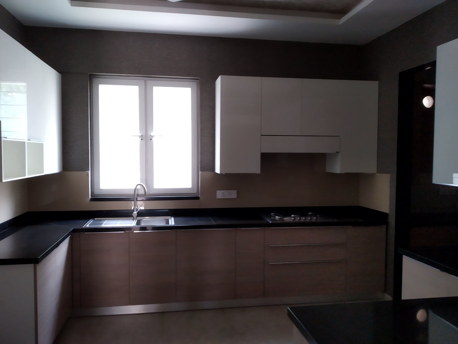 The design features a sleek L-shaped layout with premium black granite countertops, matte wood-finish base cabinets, and high-gloss white overhead units that enhance brightness and storage efficiency.