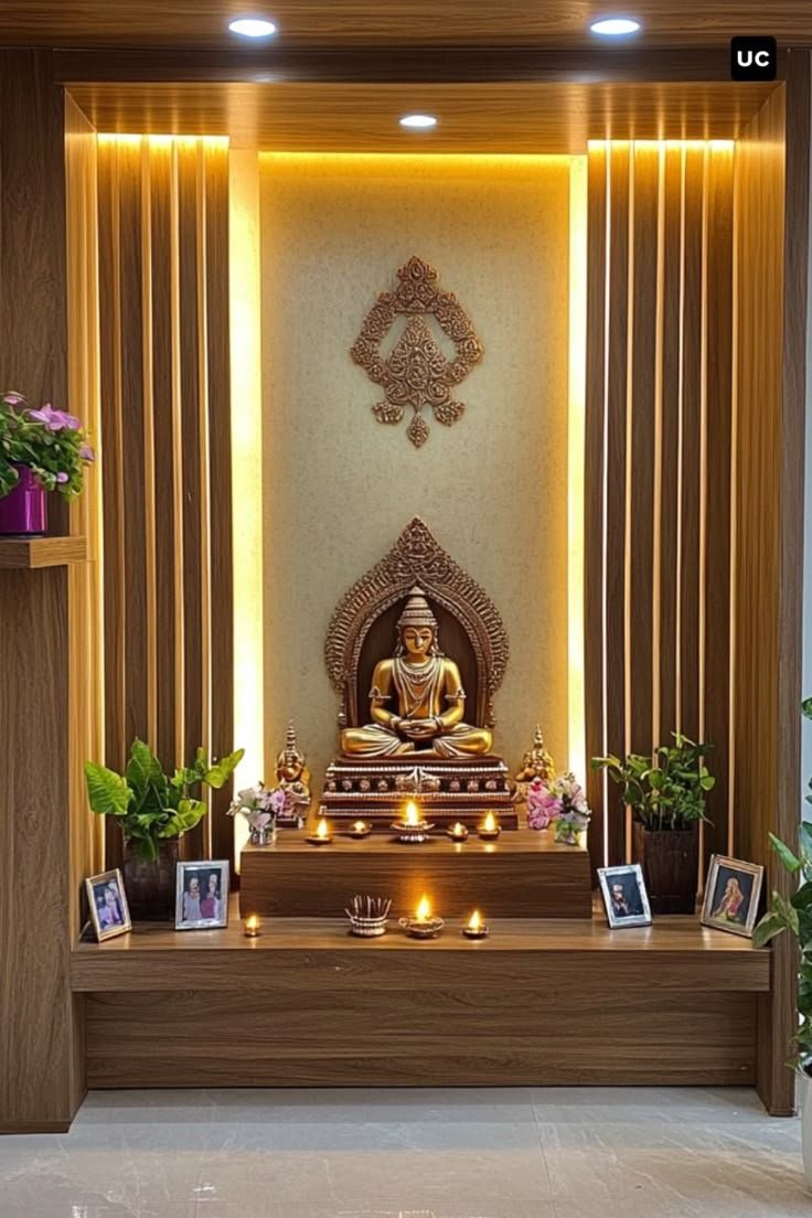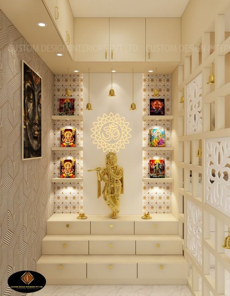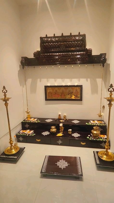 Divine Heritage Pooja Space is a traditional prayer room designed to reflect spiritual calm and cultural richness. The project features intricately carved wooden elements that highlight classic Indian craftsmanship. Brass lamps and sacred décor enhance the divine ambiance of the space. The black platform with inlay patterns adds elegance and contrast. Soft lighting creates a peaceful and meditative atmosphere. The layout ensures functionality while maintaining sacred symmetry. This design blends devotion, tradition, and timeless aesthetics.