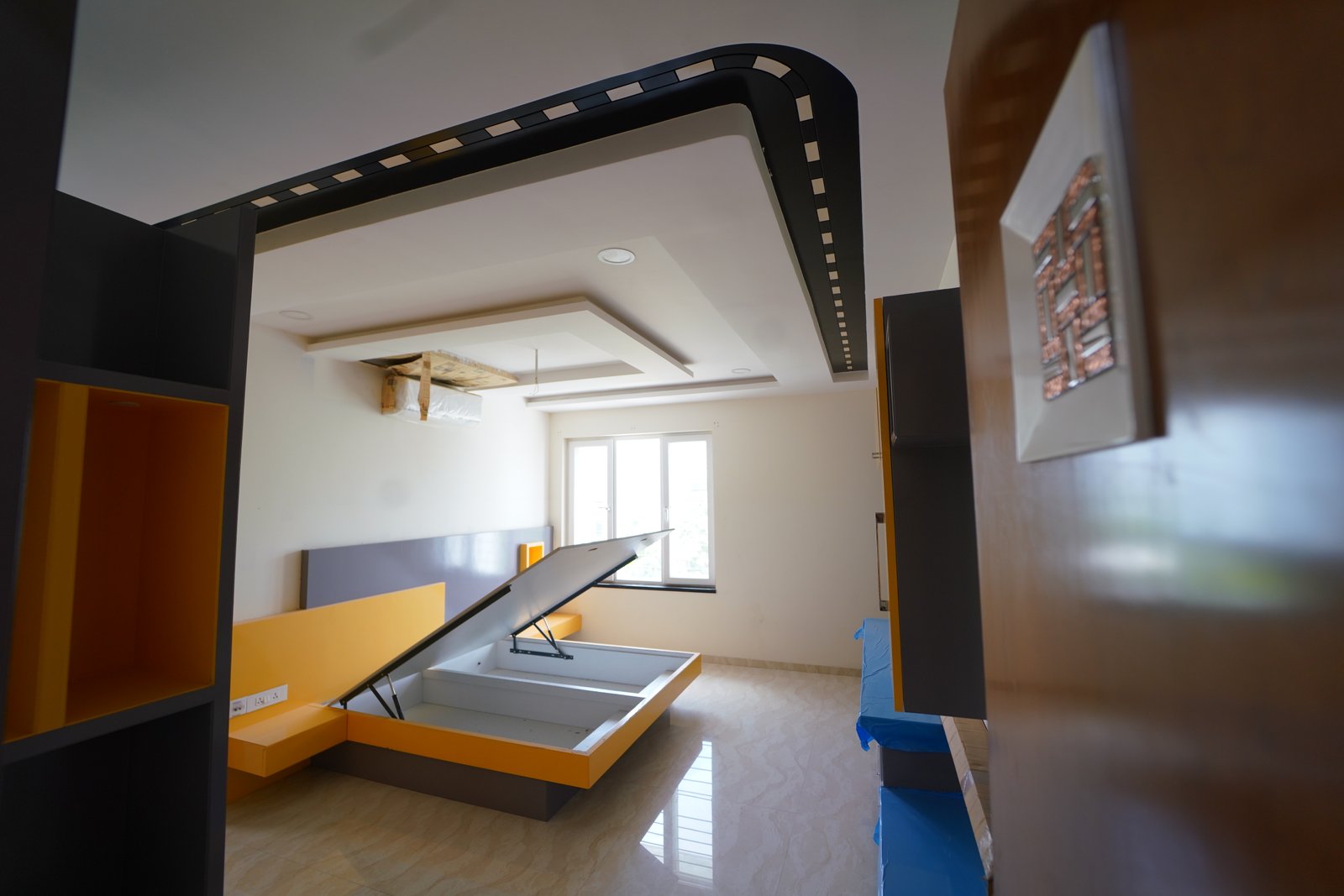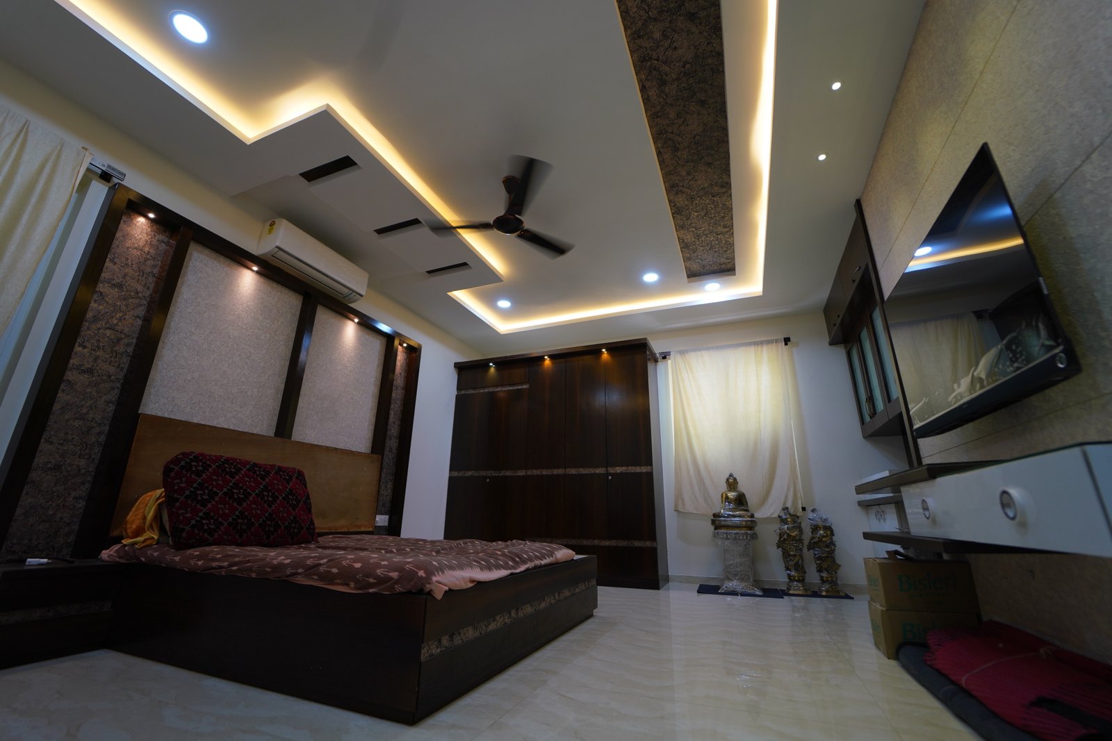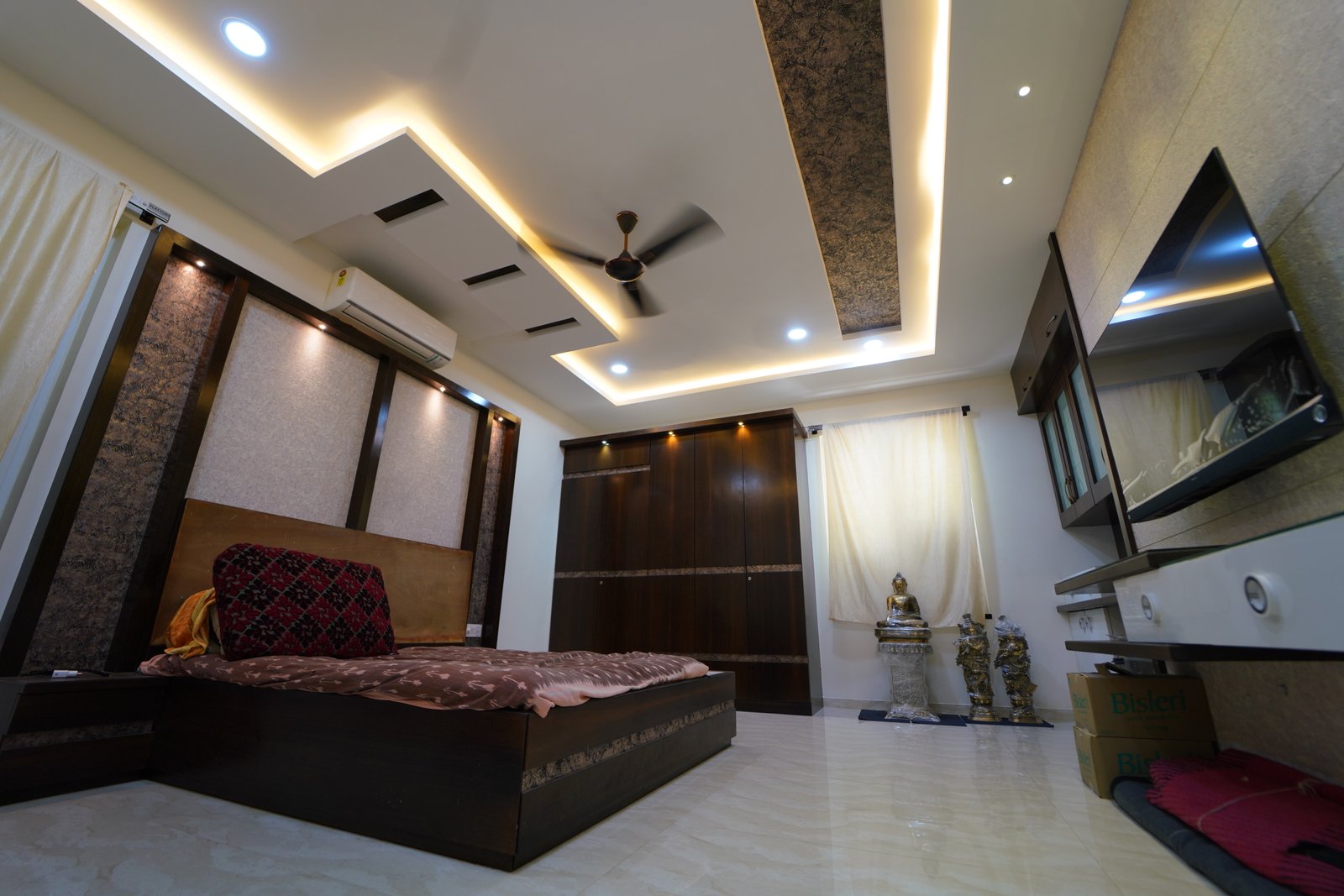 This project showcases a modern master bedroom interior designed with a perfect balance of comfort, elegance, and functionality. The room features a contemporary false ceiling with warm cove lighting, recessed spotlights, and a sleek ceiling fan that enhances ambient lighting. Dark wood wardrobes and wall paneling add depth and sophistication, while the textured TV unit with floating storage provides a clean and organized look. Neutral flooring, soft furnishings, and well-planned lighting create a calm and luxurious bedroom atmosphere suitable for modern living