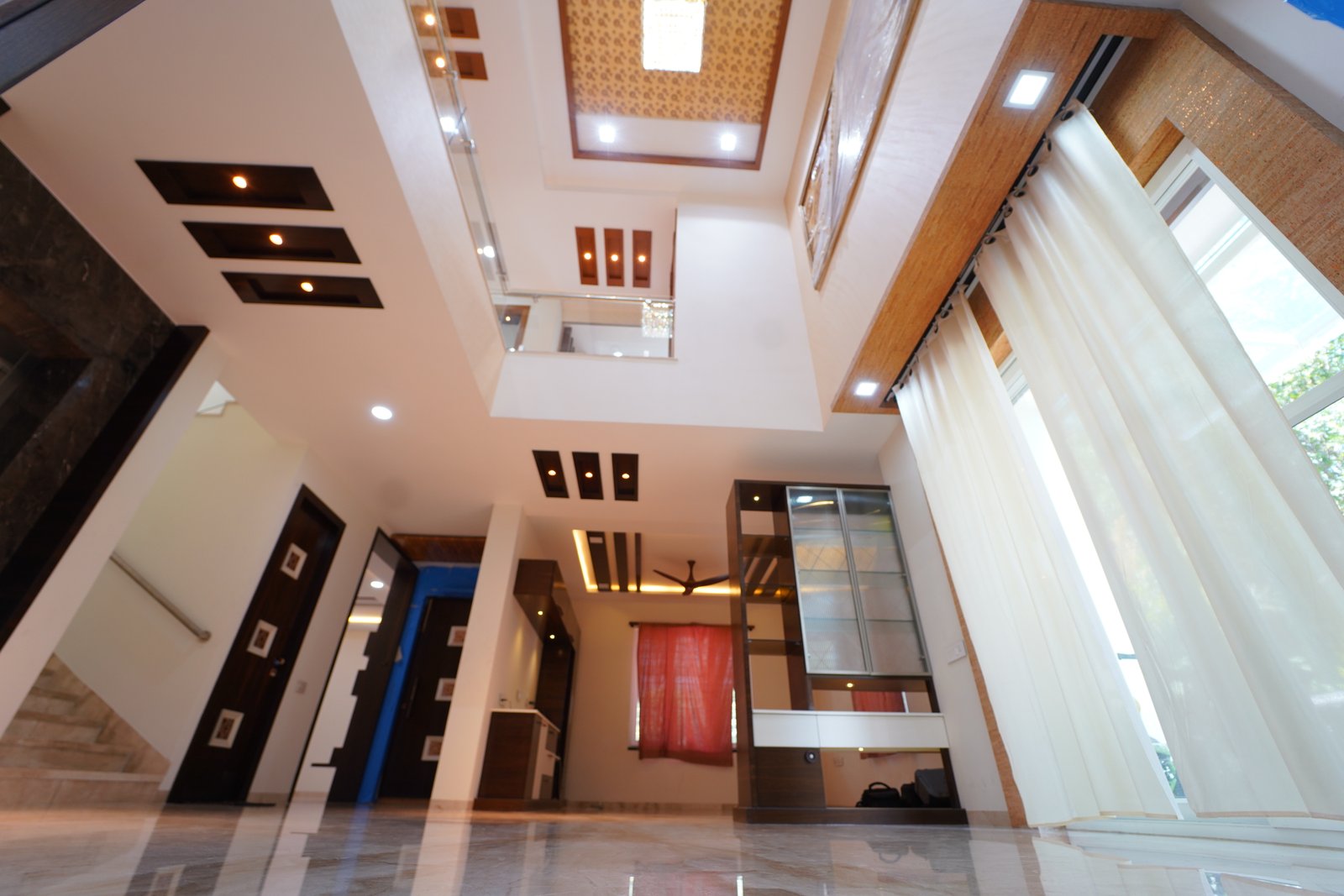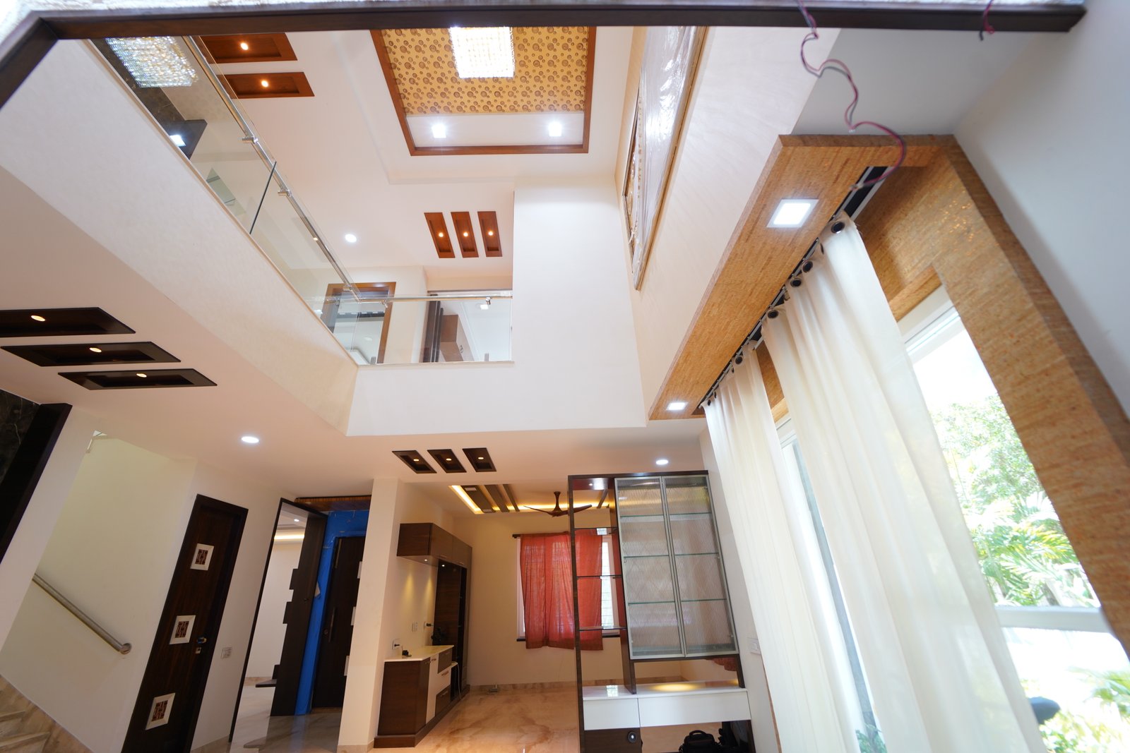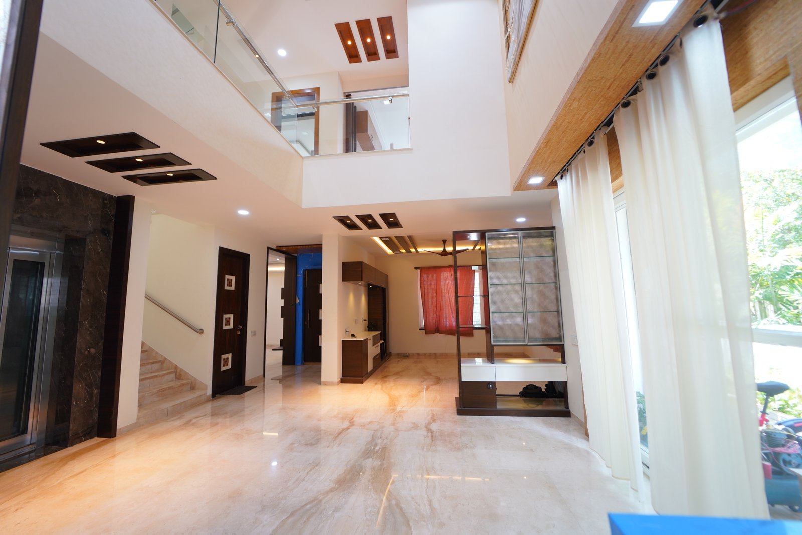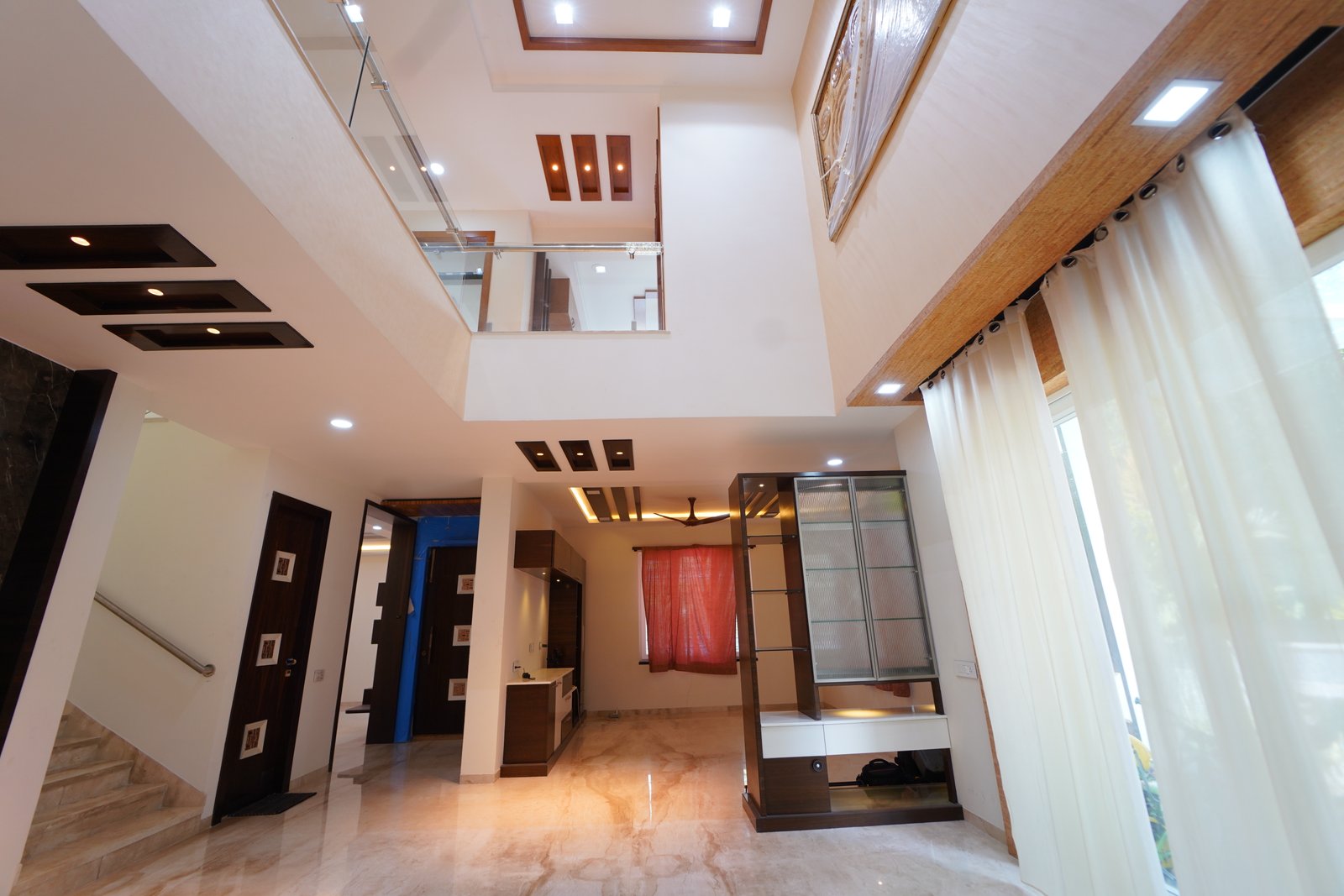 This project features a contemporary double-height living hall designed to create a grand and open living experience. The space highlights high ceilings with modern false ceiling patterns, recessed lighting, and elegant wooden accents that add warmth and character. Glass railings enhance visual openness while allowing natural light to flow seamlessly across levels. Polished marble flooring, custom storage units, and thoughtfully planned lighting complete the design, making the hall spacious, luxurious, and ideal for modern homes.
