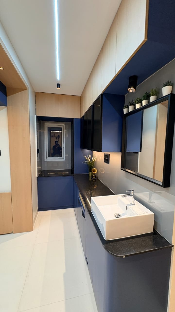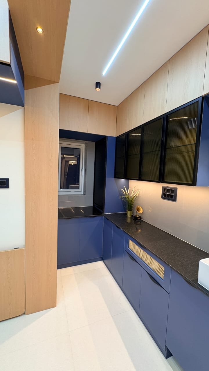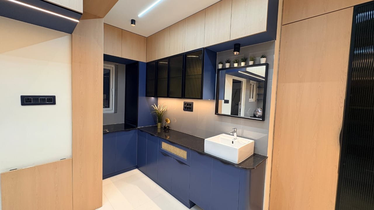 This modern modular kitchen is designed with a sleek and functional layout, featuring a sophisticated blue and wood-tone color palette. The space includes handle-less lower cabinets, textured glass upper units, and a durable black granite countertop for a clean, contemporary look. Integrated LED strip lighting and a minimal false ceiling enhance brightness and depth, while smart storage solutions ensure maximum efficiency. The compact wash basin area with mirror seamlessly blends utility with design, making this kitchen both stylish and highly practical for everyday use.